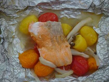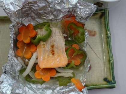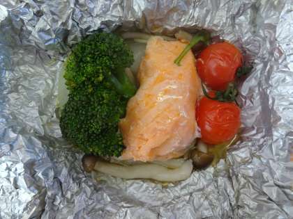 せっかくですので、鮭のアルミ焼きを紹介します。生徒に聞くところによると、鮭は先生が用意してくれて、中に入れる野菜は、自分たちで家からもってくるそうです。ですから中の野菜が生徒によって違っていて、色合いもよいです。少しだけ紹介します。せっかく、家庭科で作ったのですから、家でも作って家族に振る舞ってくださいね。