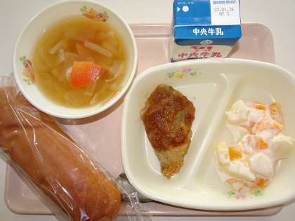 本日の給食は、牛乳、あいちの米粉パン、冬野菜のスープ、ほきフライのタマネギソースかけ、フルーツのヨーグルト和えでした。ほきのフライがとてお柔らかくておいしかったです。ごちそうさまでした。