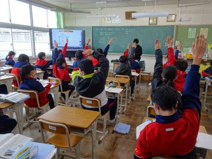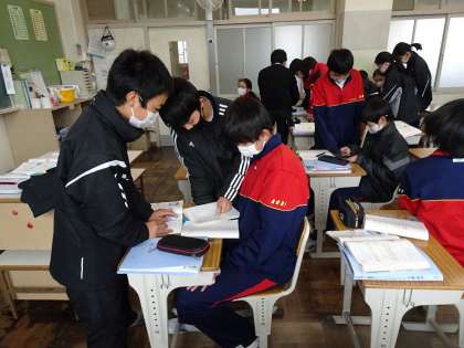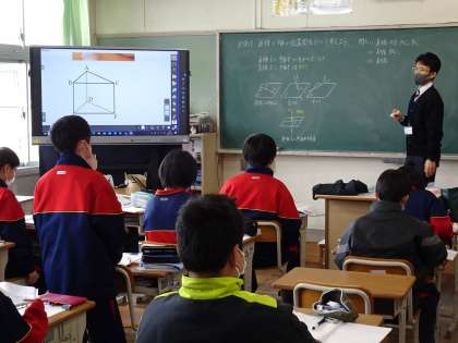 平面と直線の関係を考える授業でした。下敷きや教科書を平面代わりに、シャーペンを直線代わりにして話し合っていました。この学級の生徒は、よく手を挙げます。そして、手の挙げ方が美しい生徒も多く見かけました。先生もうれしそうに指名していました。