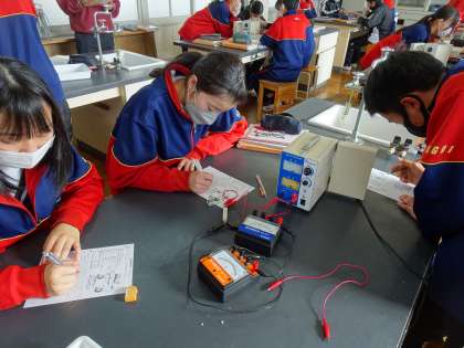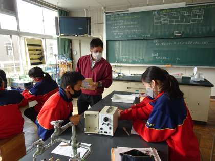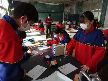 こちらの理科室では、2年生が電流と電圧の関係について、実験をしていました。