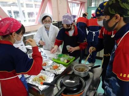 調理室では、1年生が鮭のホイル焼きと汁物を作っていました。調理室は、鰹節のお出しのとてもよい香りが漂っていました。