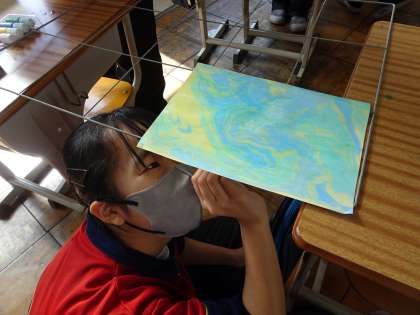 マーブリング(墨流し)の作品の裏に起用に名前を書いていました。