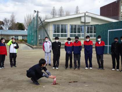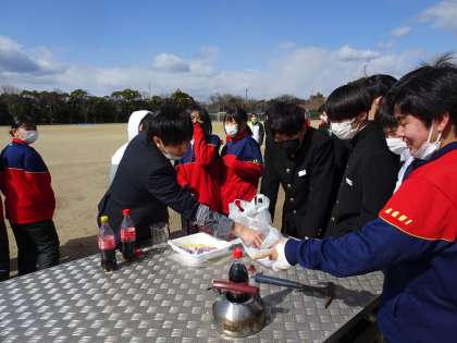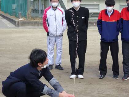 運動場で、炭酸飲料に、メントスを入れたらどうなるのかという実験をしていました。先生、手がびしょびしょになっていました。砕いたメントスを入れるよりも、そのままメントスを入れたほうが噴き出すのは、予想を裏切られました。他にも炭酸飲料の種類や温度によっても、噴き出し方が違うようです。とても楽しい実験の授業でした。