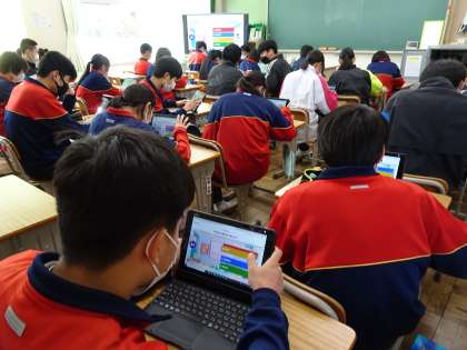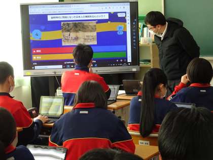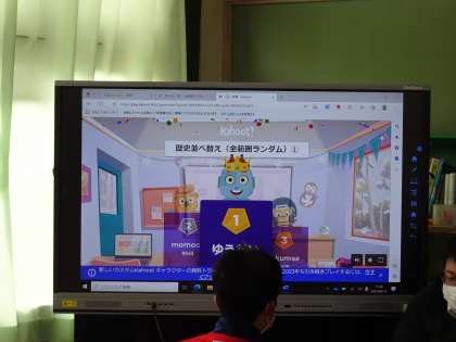 タブレットを使って、社会の歴史クイズをやっていました。正解の多いベスト3の生徒が紹介されていました。このようにクイズ形式だと、楽しく覚えられてよいですね。