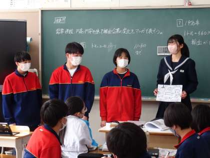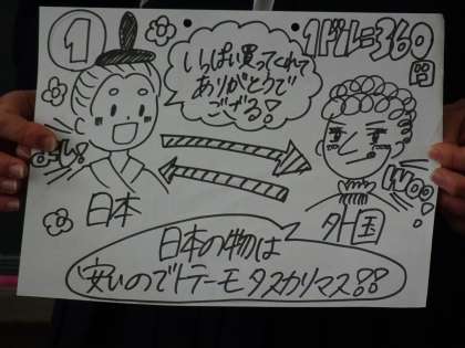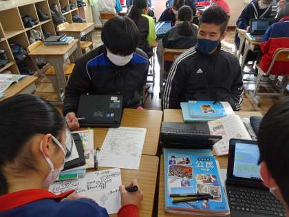 こちらも社会科の授業です。こちらは、学習課題が「需要、供給、円高、円安を使って輸出企業の変化を漫画で表そう」というユニークなものでした。グループで四コマ漫画を作り、前に出て発表していました。とても上手に描けていますね。