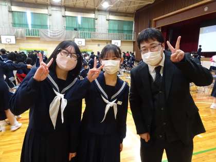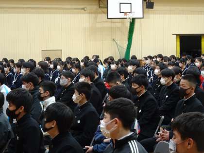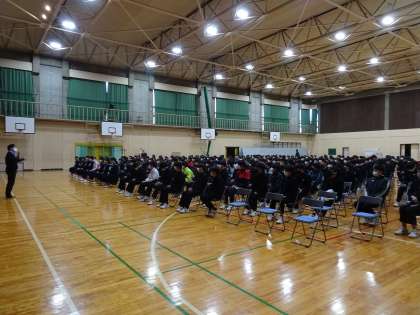 5時間目、3年生の先生が、3年生に向けて、3年間を振り返るビデオをプレゼントしました。とても感動的なビデオで、生徒の何人かが感激の涙を流していました。いよいよ卒業する実感がわいてきたのかもしれません。最後に、主任の先生が3年生に感謝と激励の呼びかけをしていました。3年生の生徒たちも真剣に聞いてくれていました。