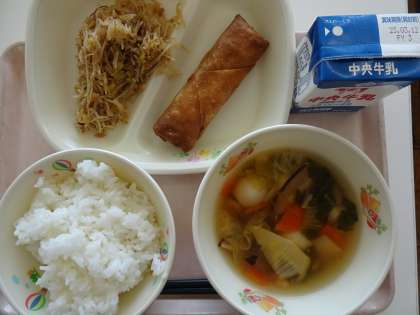 本日の給食は、牛乳、ご飯、八方湯、春巻き、ビーフン炒めでした。