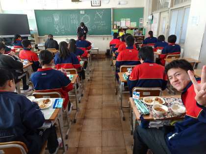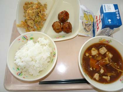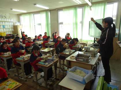 本日の給食は、牛乳、ご飯、玉ねぎの味噌汁、豆腐団子、卯の花の炒り煮、アーモンド小魚でした。この学級は、いつも元気な担任の先生がお休みなので、残菜がどうなっているか見に行ったら、ちゃんと代わりの先生が、お代わりの希望者を募って、再配膳してくれていました。