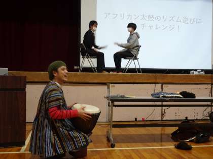 2年生を対象に、青年海外協力隊員として、ガーナでバスケットボールコーチとして活動して見えた方を講師にお招きし、ガーナについて学習しました。まずはごあいさつ代わりに、ペアになり、太鼓の音に合わせて手と手を合わせたり膝を叩くゲームをしました。