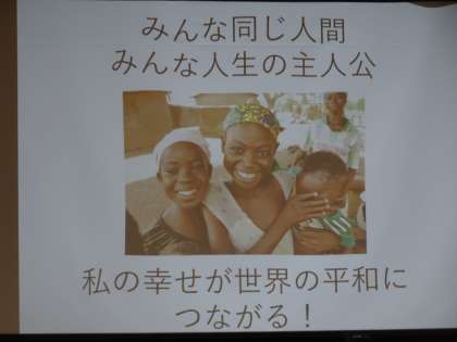 ガーナの人々が幸せになれるよう、帰国してから会社を立ち上げ、ガーナの人が作ったシアバターをフェアトレードして、雇用の創出し、貧困の解消やけいざいてきじりつを支援しているそうです。最後に「みんな同じ人間、みんな人生の主人公、私の幸せが世界につながる」というメッセージをいただきました。講演終了後、代表生徒がお礼を伝えました。