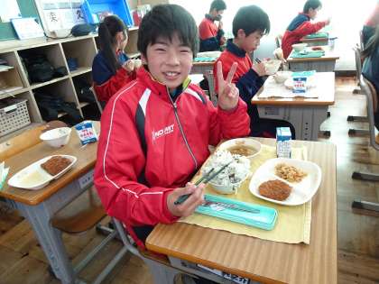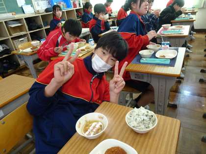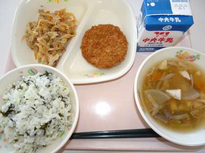 本日の給食は、牛乳、わかめご飯、けんちん汁、和風コロッケ、切り干し大根の含め煮でした。今日も大盛さんに出会えました。無理強いすることはありませんが、少しでも残菜を減らせたらと思います。ご協力に感謝します。