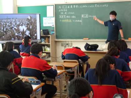 半袖姿で授業をする元気な先生の社会の授業を参観しました。日本の産業革命のところを授業していらっしゃいました。電子黒板には、綿花の写真が写っており、製綿工場や富岡製紙工場の話をされていました。先生が、次の見せる写真は生徒によっては、心臓に悪い写真だから見ない人は見なくてよいという内容のお話をされたので、生徒の中には、目を手で覆う生徒もいました。さて、どんな写真家というと、確かに心臓に悪いかもしれません。当時はお蚕様と言われるほど、大事にされ蚕でした。